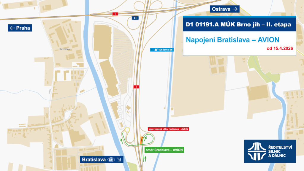 V rámci přestavby mimoúrovňové křižovatky D1 Brno jih bude dnes v noci znovu otevřen sjezd Bratislava – AVION. Úprava dopravního značení začne ve 22:00 a do půlnoci bude tato větev křižovatky opět v provozu.